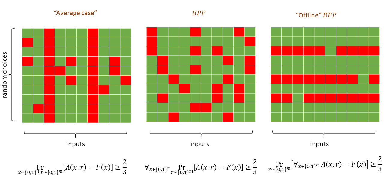 \(\mathbf{BPP}\) is a worst case class of computation: a randomized algorithm to compute a function must compute it correctly with high probability on every input.