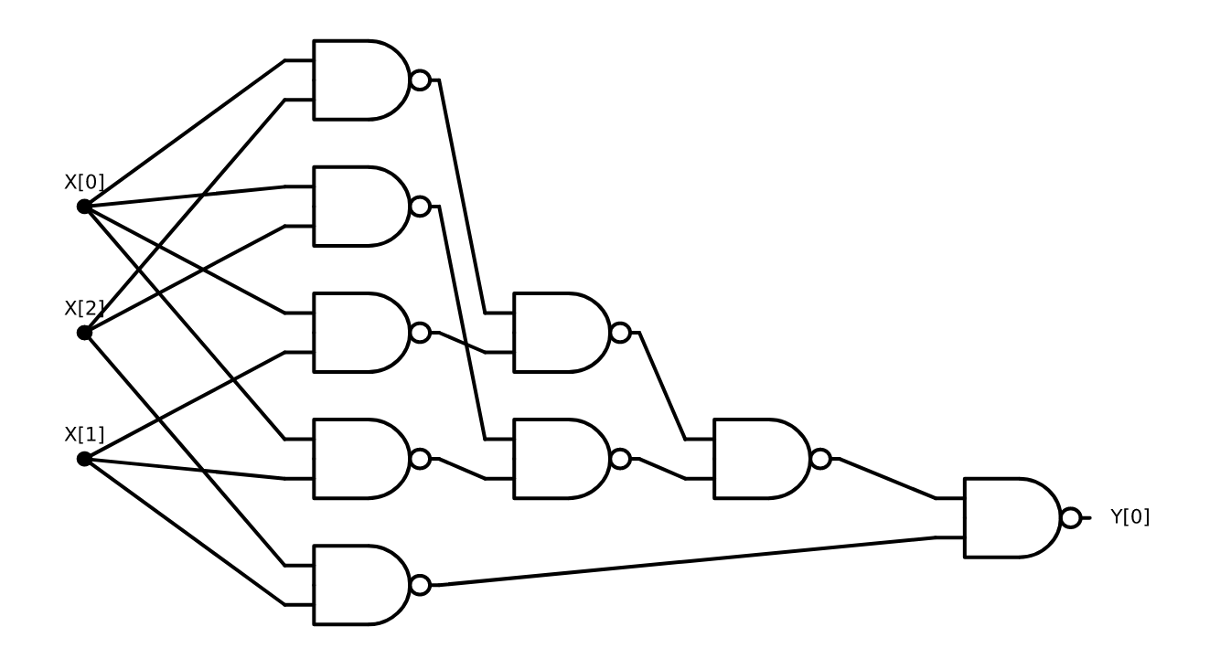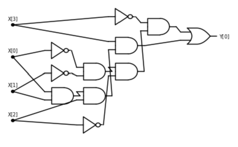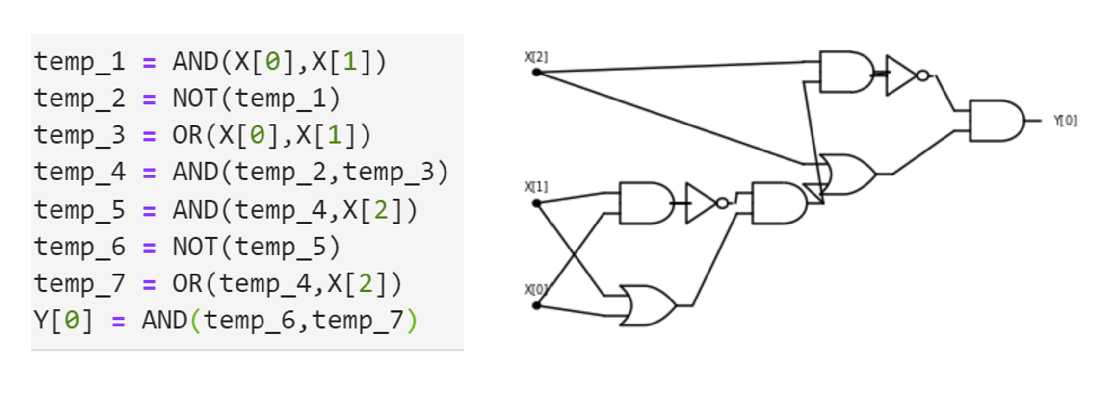Since we know how to compute \(\ensuremath{\mathit{XOR}}\) using AND, OR, and NOT, we can compose this to compute \(\ensuremath{\mathit{XOR}}_3\) using the same building blocks. In Python this corresponds to the following program: