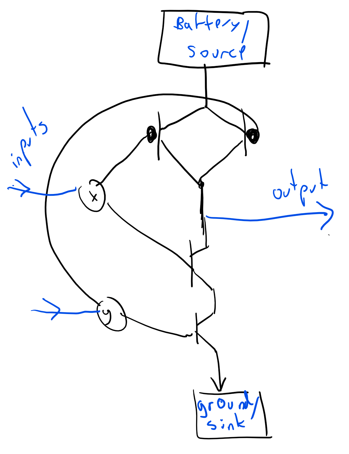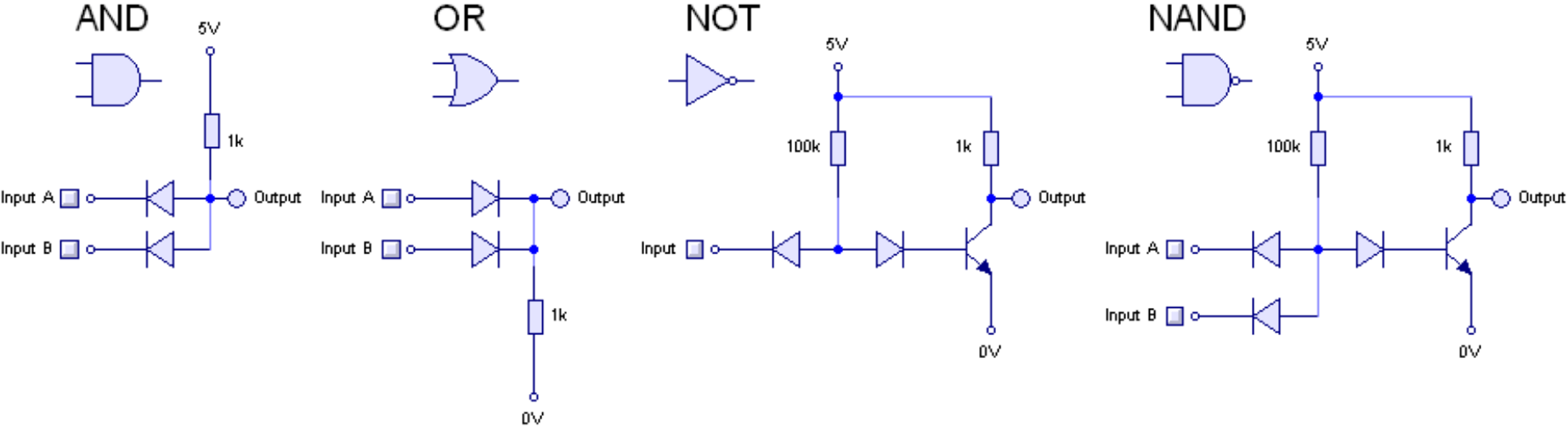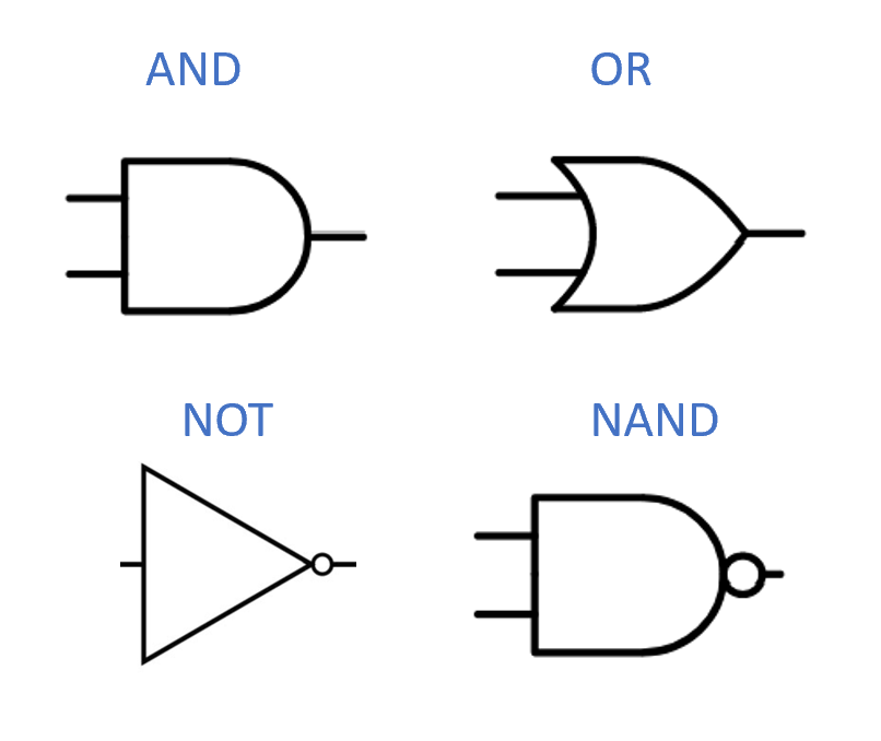 - Another candidate definition for an “elementary” operation is the \(\ensuremath{\mathit{NAND}}\) operation. It is an operation that is easily implementable in the physical world in a variety of methods including by electronic transistors.