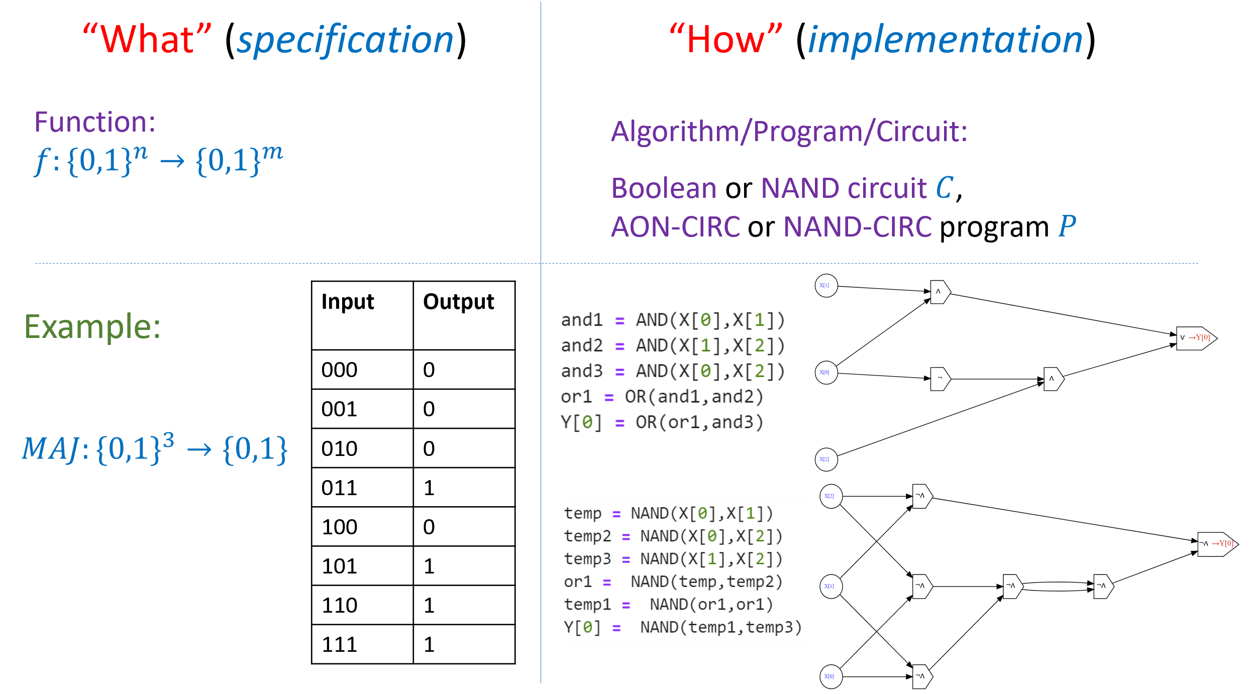 As we discussed in Section 2.6.1, one of the most important distinctions in this book is that of specification versus implementation or separating “what” from “how” (see Figure 3.31). A function corresponds to the specification of a computational task, that is what output should be produced for every particular input. A program (or circuit, or any other way to specify algorithms) corresponds to the implementation of how to compute the desired output from the input. That is, a program is a set of instructions on how to compute the output from the input. Even within the same computational model there can be many different ways to compute the same function. For example, there is more than one NAND-CIRC program that computes the majority function, more than one Boolean circuit to compute the addition function, and so on and so forth.