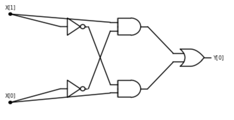 Let us see how we can obtain a different function from the same building blocks. Define \(\ensuremath{\mathit{XOR}}:\{0,1\}^2 \rightarrow \{0,1\}\) to be the function \(\ensuremath{\mathit{XOR}}(a,b)= a + b \mod 2\). That is, \(\ensuremath{\mathit{XOR}}(0,0)=\ensuremath{\mathit{XOR}}(1,1)=0\) and \(\ensuremath{\mathit{XOR}}(1,0)=\ensuremath{\mathit{XOR}}(0,1)=1\). We claim that we can construct \(\ensuremath{\mathit{XOR}}\) using only \(\ensuremath{\mathit{AND}}\), \(\ensuremath{\mathit{OR}}\), and \(\ensuremath{\mathit{NOT}}\).